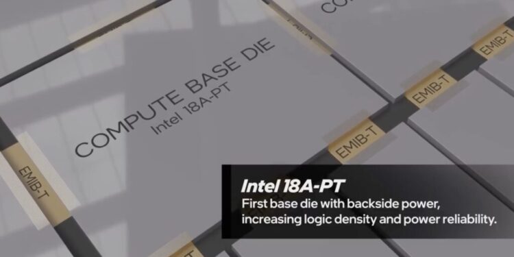 Um dos conceitos novos mais interessantes introduzidos pela Intel é o Compute Base Die, um tipo de base sobre a qual os outros tiles serão empilhados e conectados. Dentro do quadro da Intel Foundry, a empresa detalhou uma versão de seu nó 18A, chamada 18A-PT, projetada para integrar tecnologias avançadas de encapsulamento e servir como “fundação” do sistema. Essa nova abordagem inclui a entrega de energia pela parte traseira, que separa as rotas de potência e sinal, aumentando a densidade e melhorando o desempenho elétrico — pontos críticos quando se lida com blocos empilhados e aumentos de consumo.