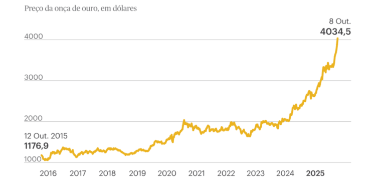O preço do ouro, que é frequentemente visto como um refúgio seguro para investidores durante períodos de incerteza, alcançou um novo recorde histórico nesta quarta-feira, ultrapassando a marca de 4.000 dólares por onça pela primeira vez na história. O valor chegou a 4.001,11 dólares às 03h00 (hora de Lisboa), enquanto o mercado asiático iniciava suas operações. Este aumento ocorre em meio a crescentes tensões políticas tanto nos Estados Unidos quanto na França, refletindo a busca dos investidores por segurança em um cenário global tumultuado.