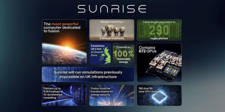 O governo britânico anunciou uma nova iniciativa em sua estratégia de energia, destinando 45 milhões de libras para desenvolver Sunrise, um supercomputador com capacidade de 1,4 MW, projetado especificamente para pesquisa na área de fusão nuclear. A previsão é que o sistema comece a operar em junho de 2026, no campus de Culham, sede da UK Atomic Energy Authority (UKAEA), em Oxfordshire.