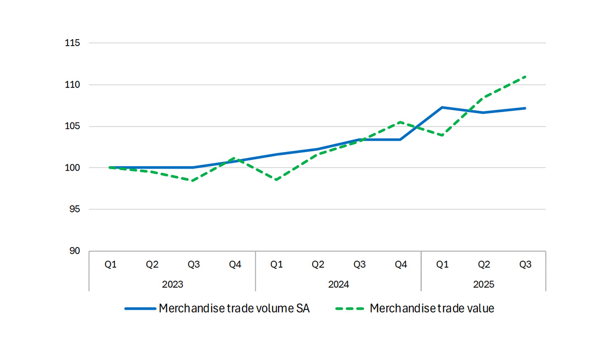 No terceiro trimestre de 2025, o volume do comércio mundial de mercadorias atingiu um patamar elevado, após uma forte expansão na primeira metade do ano. Essa expansão foi impulsionada por fatores como a antecipação de importações, condições macroeconômicas favoráveis e um aumento na demanda por produtos relacionados à inteligência artificial.